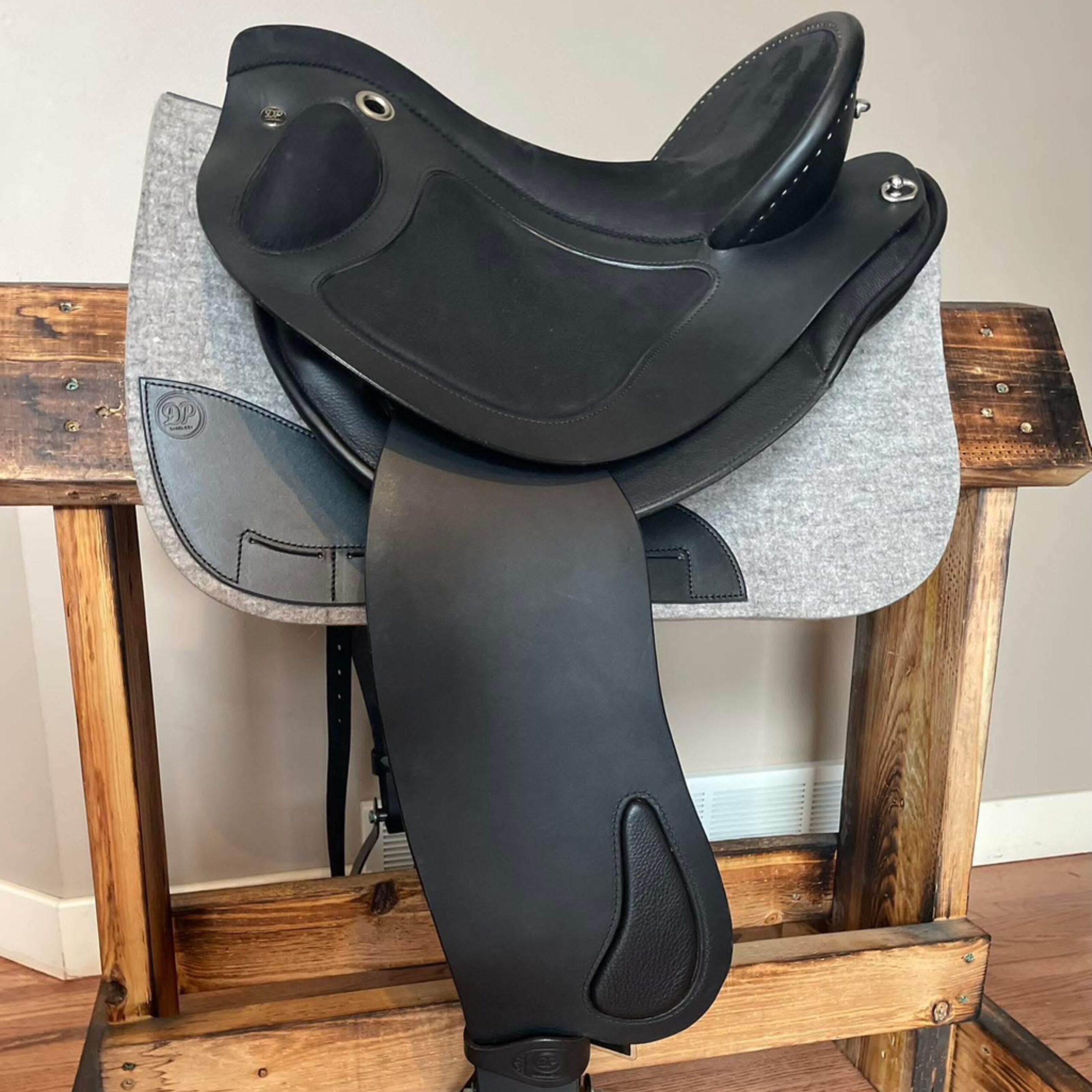 UF/VSK. Size: 1. Saddle Leather: Black. Seat Leather: Black Nubuck. Panel Leather: Black Nappa. SKL and Fender inlay: Black Nubuck. Hardware: Stainless Steel, D-Rings, Footman Loops. Stirrups: NONE. Fenders: Medium, 68cm. Makerplate: DP Saddlery Silver.